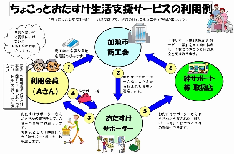 この事業は、ボランティアに頼らない自立した社会を構築する事を目的とする商工会と加須市が運営主体となって行う事業で、手助けを必要とする高齢者の方などに「絆サポート券」を購入してもらい、「おたすけサポーター」として商工会に登録された福祉活動のサポーターが報酬という形で受け取る仕組みです。