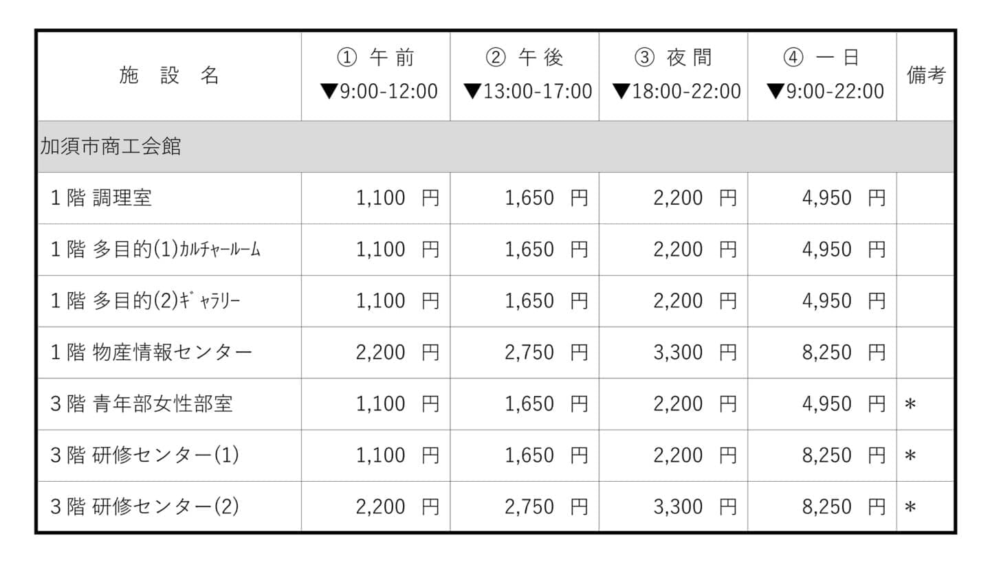 ※電話にて空き状況を確認の上、「加須市商工会館」2階事務室受付まで、直接お越しください。