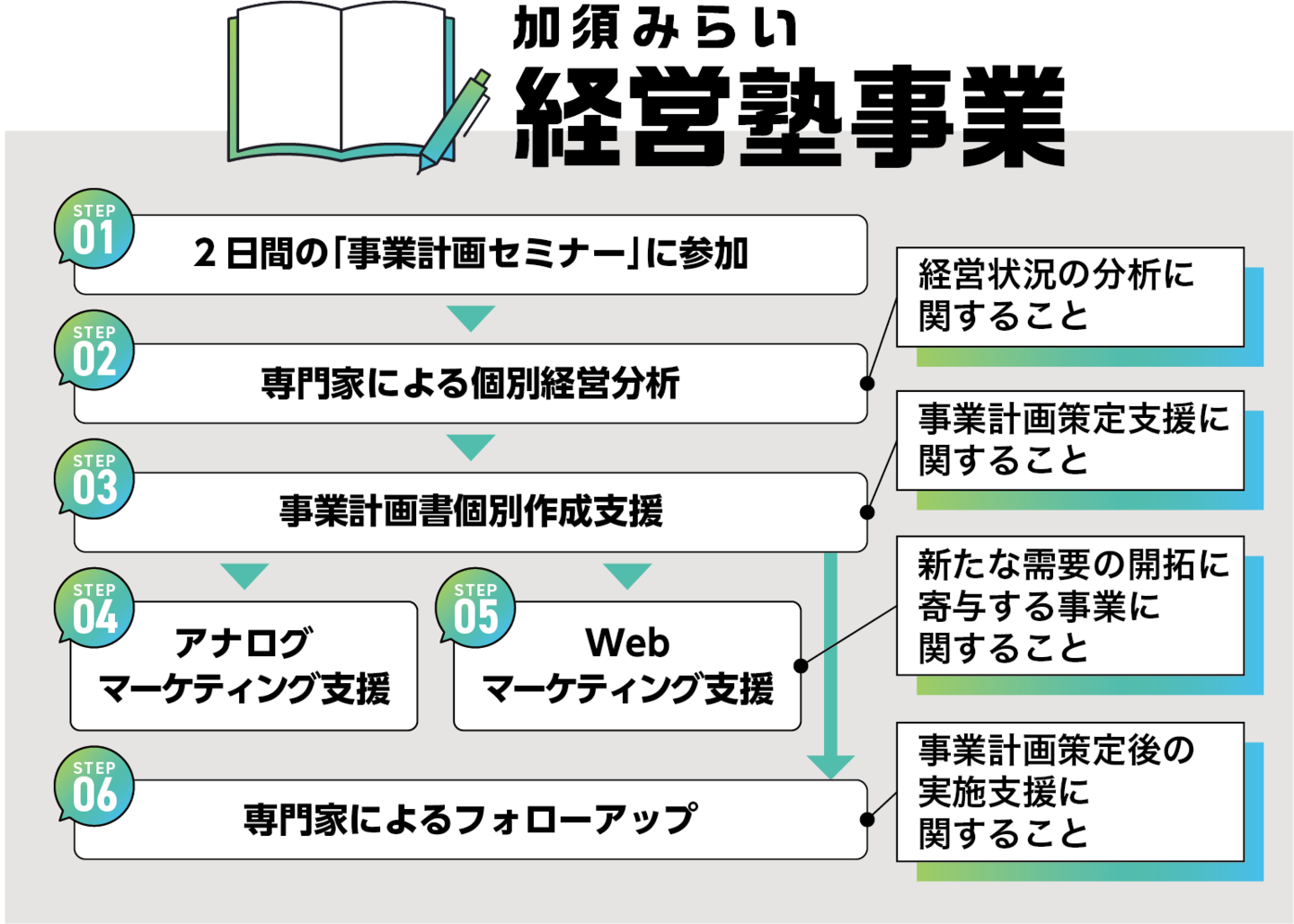 本事業では、①「事業計画セミナー」を導入部とし、②専門家による個別経営分析の実施、③事業計画書個別作成支援、④アナログマーケティング支援、⑤Webマーケティング支援、⑥専門家による事業計画のフォローアップがひとつのパッケージとなってます。